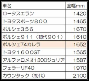 以下に私の頭に浮かんだ名車の車幅比較を載せます。今回の911RSは日本のワインディングロードでは最大許容範囲化しら?実際走ってみると高速道路インターチェンジなどちょうどよい感じ、という事は筑波の山はいいけど御岳スカイラインには大き過ぎという感じかな?